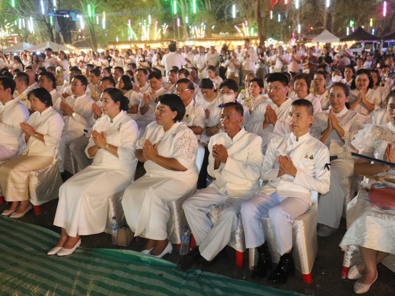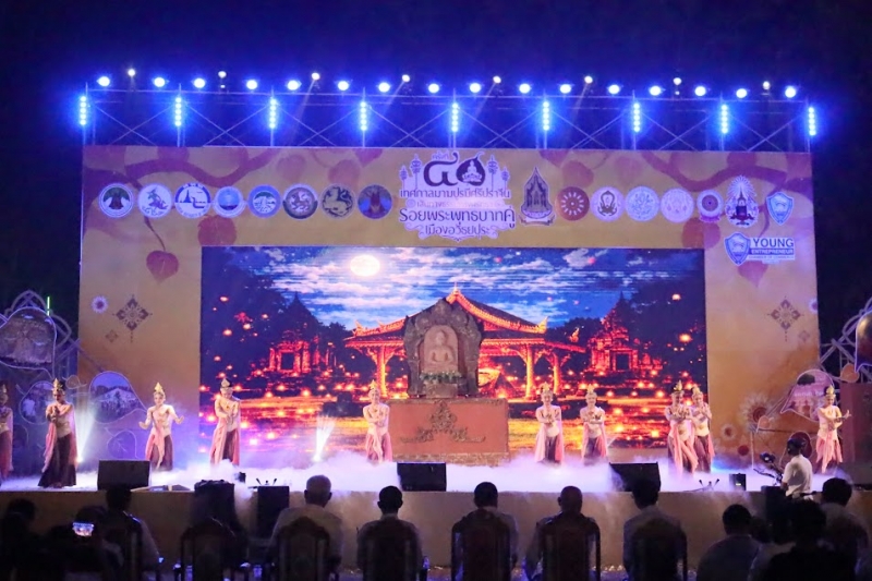 หลังเสร็จสิ้นพิธีเวียนเทียน ผู้ร่วมงานรับชมการแสดง “แสง สี เสียง ย้อนรอยประวัติศาสตร์ เส้นทางธรรมแห่งศรัทธา รอยพระพุทธบาทคู่ เมืองอริยปรุระ”