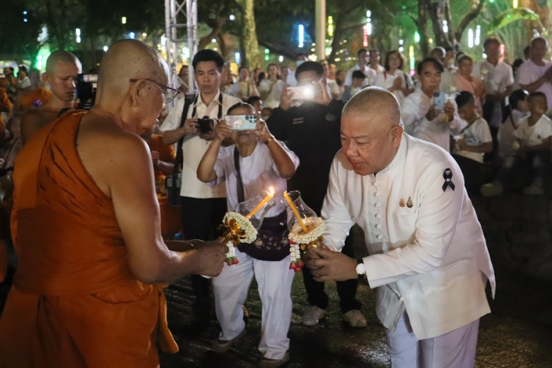 ประธานสงฆ์นำพระภิกษุสงฆ์ พร้อมด้วยผู้ว่าราชการจังหวัดปราจีนบุรี รองผู้ว่าราชการจังหวัด ข้าราชการ และประชาชน เวียนเทียนรอบรอยพระพุทธบาทคู่ จำนวน 3 รอบ